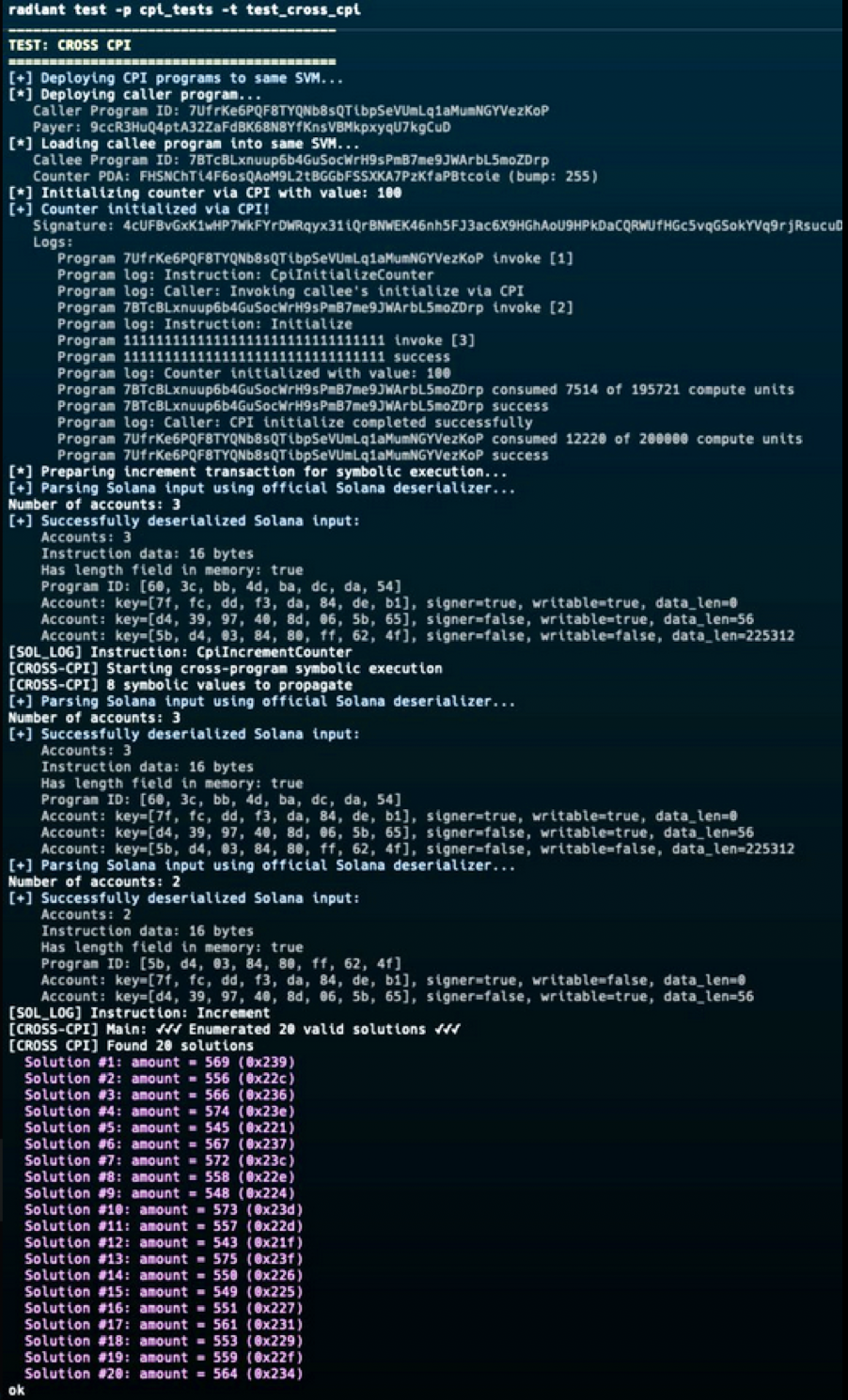 Cross-CPI Symbolic Execution: Radiant consumes symbolic solutions with translated constraint contexts across CPI boundaries, allowing evaluation of invariants involving program composition.