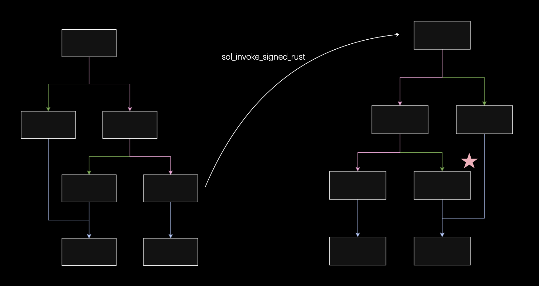 The diagram illustrates this problem. On the left, we have the caller program’s control flow graph, and on the right, the callee program’s CFG. The target basic block (marked with a star) resides within the callee program’s execution paths, only reachable after a sol_invoke_signed_* CPI call from the caller.