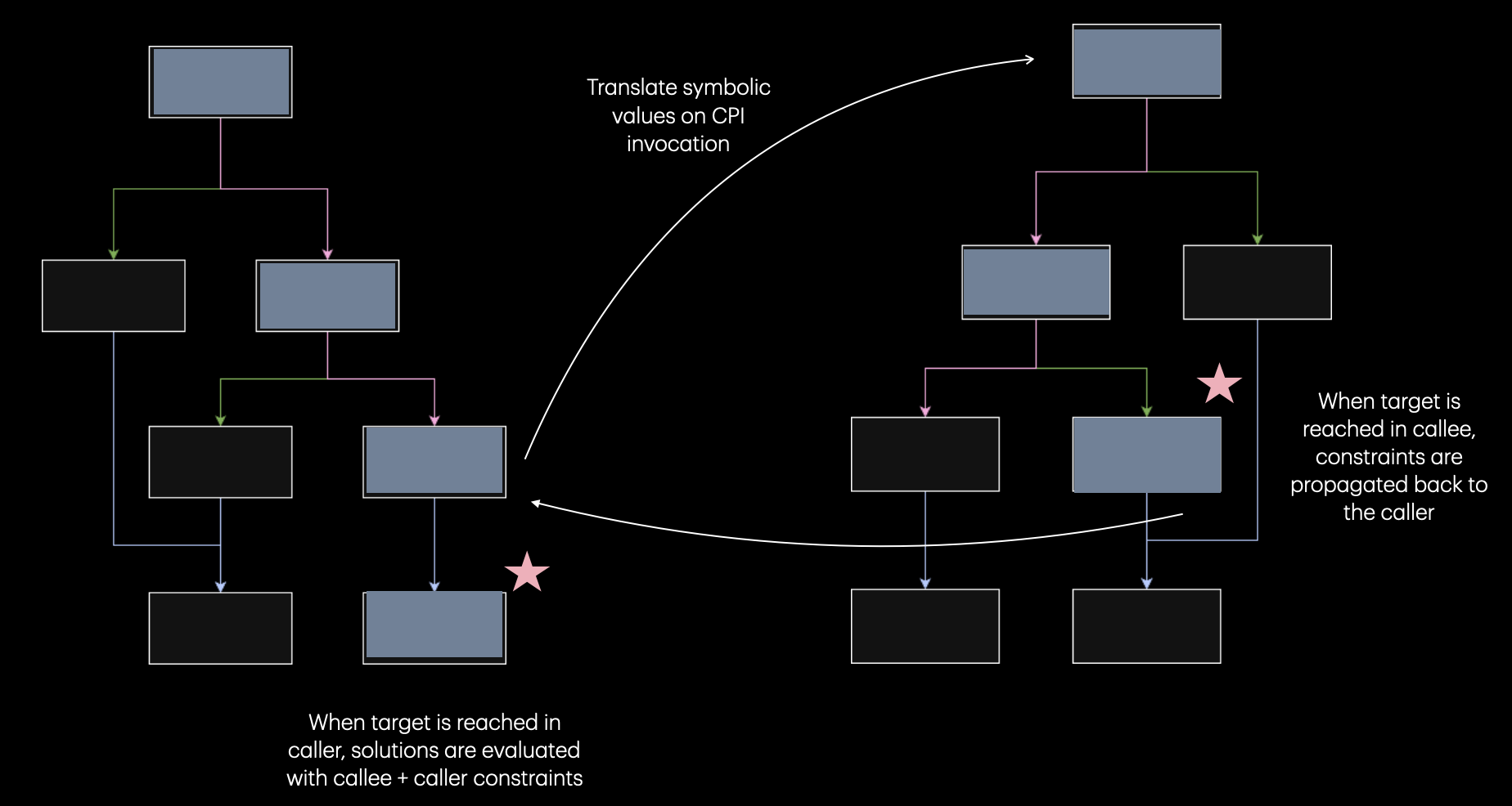 Traditional symbolic execution frameworks would struggle here, they typically analyze single programs in isolation. To reach the target in the callee, you need to understand how values are transformed through the CPI boundary and propagate constraints backward through both programs.